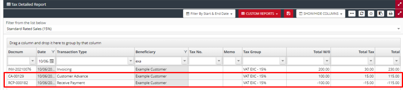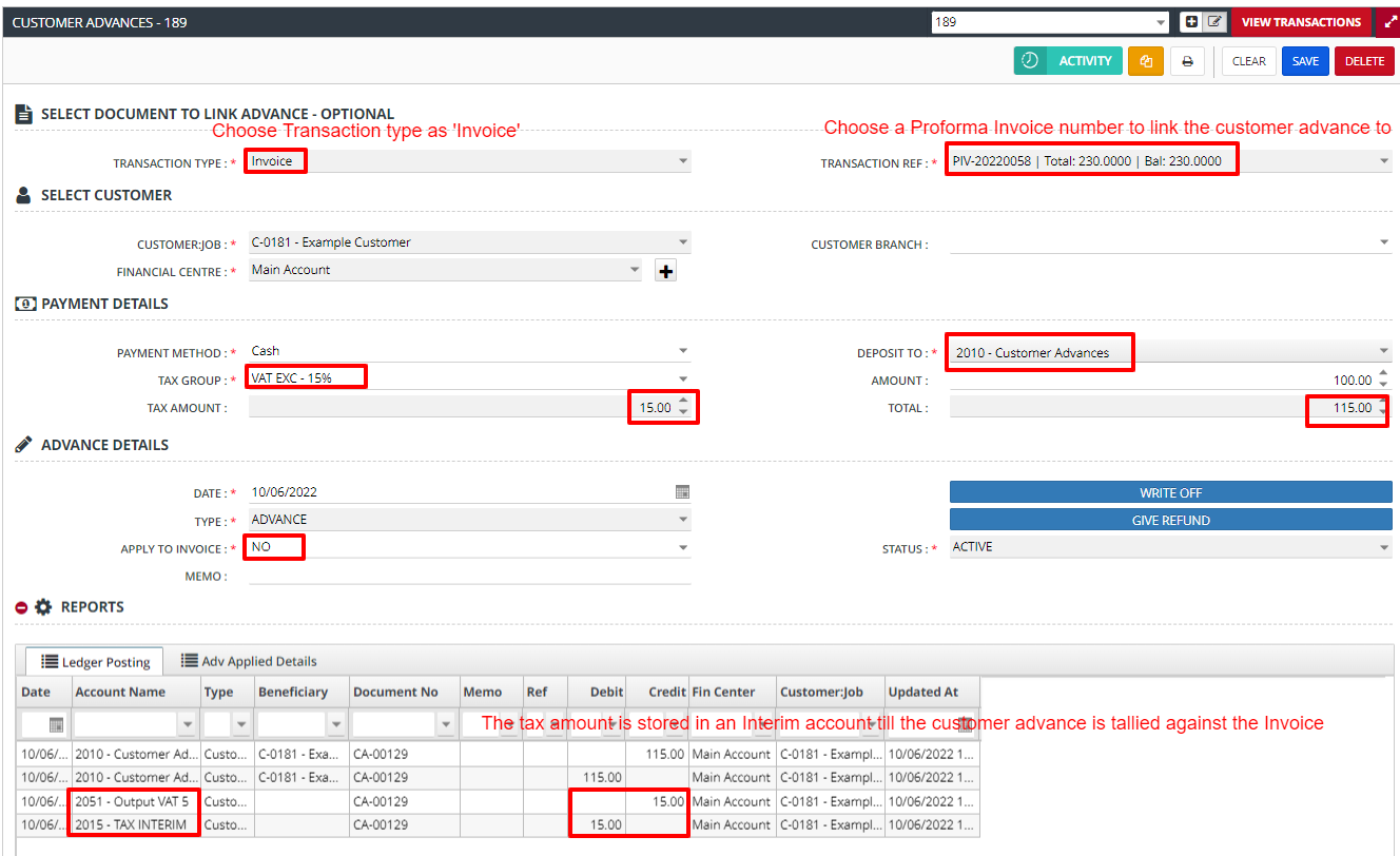 Once the Customer Advance is tallied against payment for the Invoice, the tax amount stored in the Interim ledger is reversed and the Invoice amount is only impacted in the Ledger.